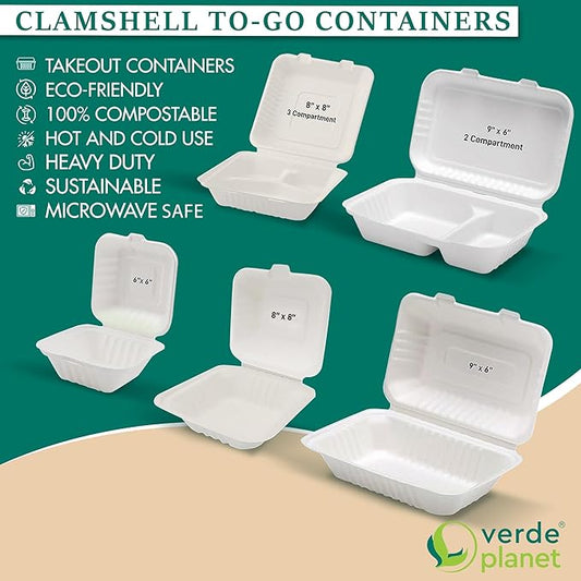 Verde Planet - 8" 3-Compartment Clamshell Sugarcane Take-out Container, Compostable | Case of 200
